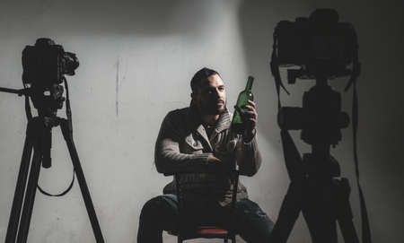 Young man with beard, lost in the vices of alcoholism, smoking and drug addiction