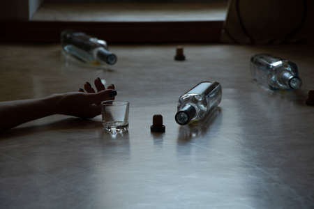 A womans hand lies on the floor and next to it is a bottle and a glass in an apartment in the dark, alcoholism and drinking, a bad habit, alcoholism