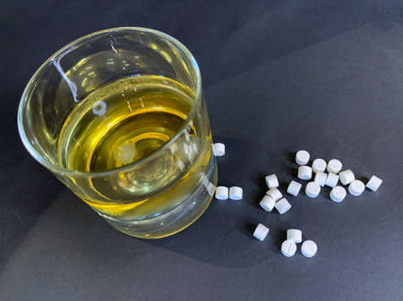 A glass of whiskey with ice and a lot of white pills on a gray background. Suicide concept with tablets and alcohol. Stock image.