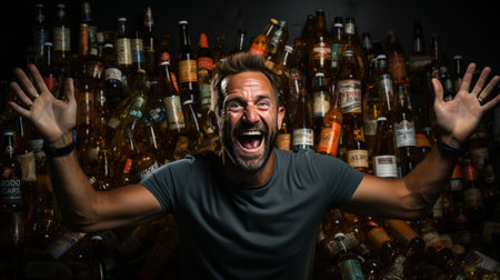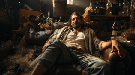 The man is angry and has problems with alcohol, there are a lot of empty glass bottles around