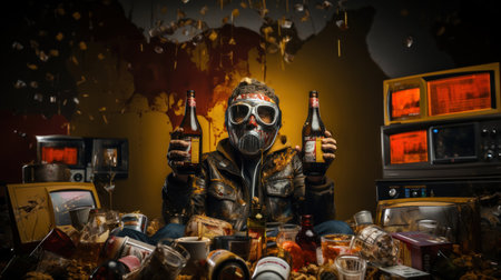 Post apocalypse man in a gas mask with a bottles of beer in junk mess.