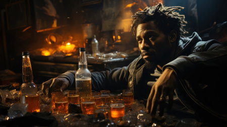 A somber scene depicts a young man with dreadlocks seated among numerous alcohol bottles in a dimly lit, cluttered room, conveying feelings of solitude and contemplation.