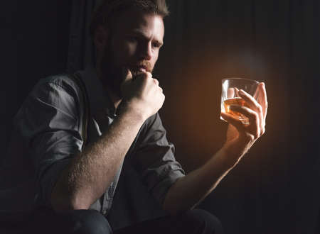 A handsome young man with a beard is sitting in a dark room with a glass of alcohol in his hands. The concept of rest and relaxation, booze and loneliness
