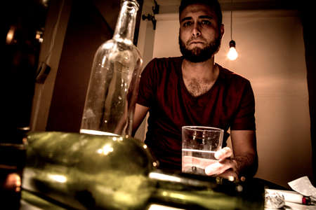 Young man with beard, lost in the vices of alcoholism, smoking and drug addiction