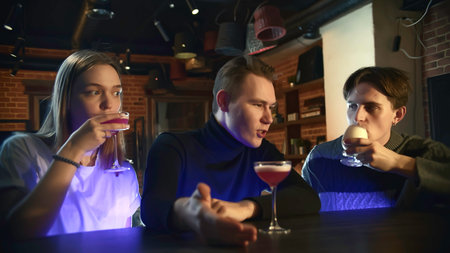 Group of friends are sitting at bar and drinking cocktails. Media. Friends drink at bar for weekend meeting. Friends chat and drink cocktails in abra on weekend