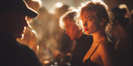 Beautiful young woman in a evening dress standing in dramatic warm light at crowded bar or party.