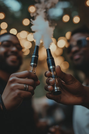 Two smiling friends holding vapes with glowing lights and smoke, bokeh lights in the background