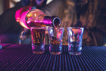 Variation of hard alcoholic shots served on bar counter. Blur bottles on background.