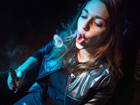 Close-up of the face of a Veper girl Portrait of a vaper woman. Girl is vapit. A woman releases a ring of steam from her mouth. A student lets out figures from the smoke of cigarettes. Smoking steam