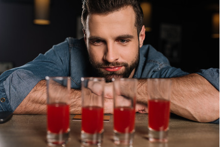 handsome visitor sitting at bar counter and looking at four shot drinks