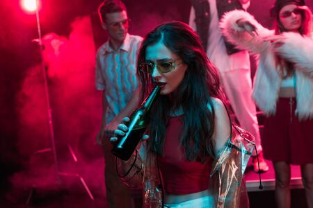beautiful girl in sunglasses drinking beer in nightclub during rave