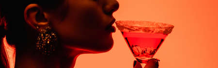side view of young woman drinking margarita cocktail on orange, banner