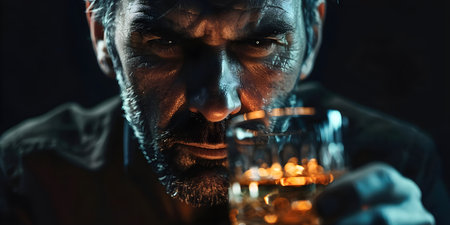 Man in distress holding glass of alcohol symbolizing struggle with addiction and pain of dependency. Concept Addiction, Alcohol Dependency, Mental Health, Despair, Coping Mechanisms