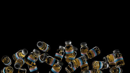 Covid-19 Vaccine bottles rotation in the air. close-up liquid detail in bottles 3d render