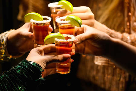 Women with shots of tasty tequila, closeup