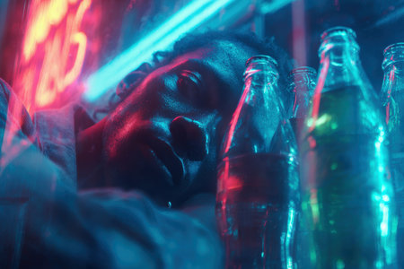A man appears overwhelmed in a futuristic cyberpunk setting, with vibrant neon lights reflecting off metallic bottles. The image captures a striking urban atmosphere with vivid color contrasts.