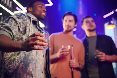 Multiethnic friends with cocktails and tequila shots spending time in bar at night