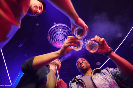Holding glasses in hands. Group of friends having fun in the night club together.