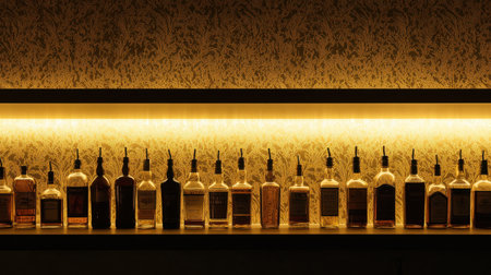 A visually striking array of whiskey bottles highlighted by warm ambient lighting creates an inviting atmosphere for gatherings and social events in a stylish bar setting.