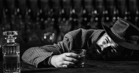 Drunk man holding glass. Client of beer pub sleeping and lying with his head on table.