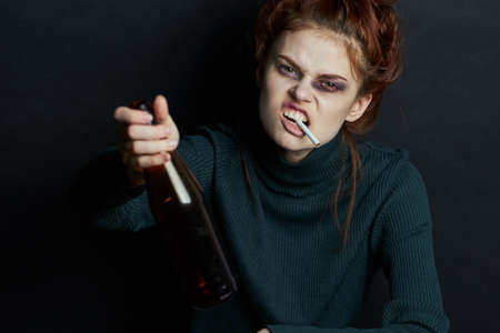 woman with bottle of alcohol smokes a cigarette depression bruises under eyes emotions
