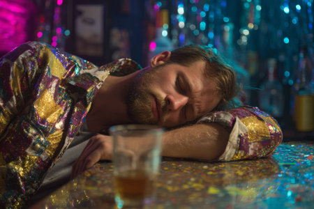 A man is resting his head on a bar counter after a night of partying. The background shows colorful lights. A glass sits nearby, indicating drinks were consumed.