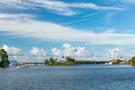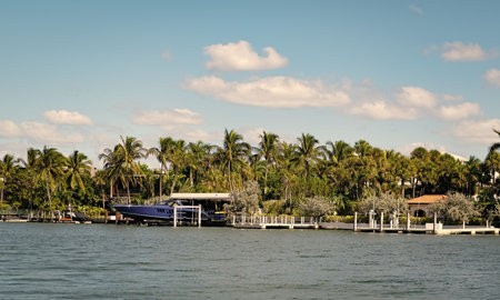 Vacation in summer paradise. Luxury house apartment. Travel to bay at Florida neighborhood. Summer vacation in tropical residential house. Luxury summer villa with yacht pier. Scenic cityscape