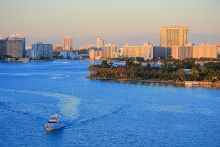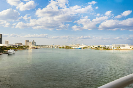 Miami, FL, United States - April 20, 2019: Late day view of Miami, looking north toward the Miami Beach Marina and highrise buildings from a cruise ship sailing past the Meloy Channel in Florida, USA.