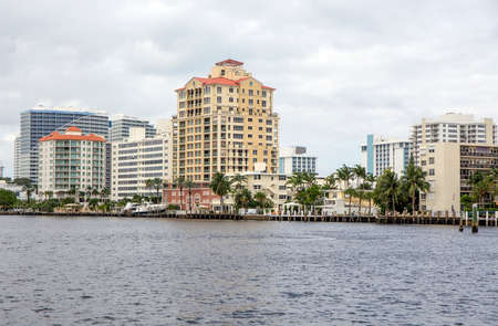 FORT LAUDERDALE, USA - JULY 11, 2017: Beautiful house in the horizont with a riverwalk promenade, highrise condominium buildings, in Fort Lauderdale, Florida