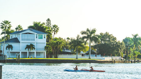 Two People Kayaking on intercoastal waterway against expensive house palm trees
