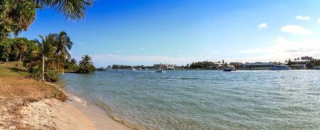 Miami landscape view on water channel, bridge with transportation on road and urban houses on cloudy blue sky background sunny day outdoor