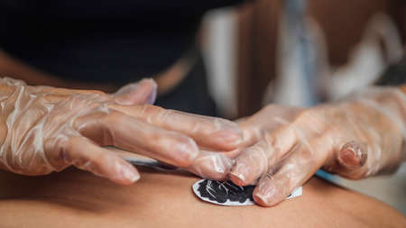 Woman's hand in blue glove applying cream on tattoo during removal procedure. Laser tattoo removal session. Medical aesthetic treatment.