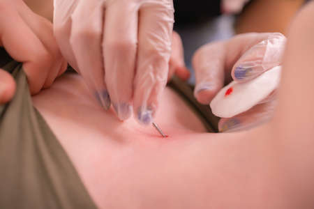 Operation to install microdermal piercing. Professional placing