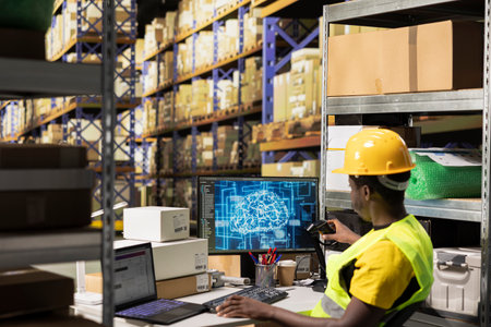 Worker taking scanner to register shipping labels tracking info, package tracking software helps handling online shopping orders with automation in warehouse.