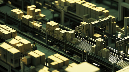 A top down view of sorting facility with conveyor belts transporting packages efficiently. vibrant lighting creates dynamic atmosphere..