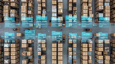 Aerial view of a large warehouse with rows of stacked boxes, forklifts, and digital data overlays showing inventory and logistics information.
