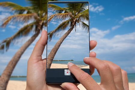 Women taking pictures on mobile phone palm tree and sea on exotic vacation.