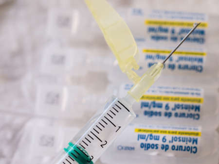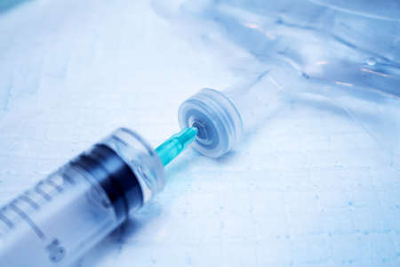 Syringe with a needle and steril sodium chloride ampoules.