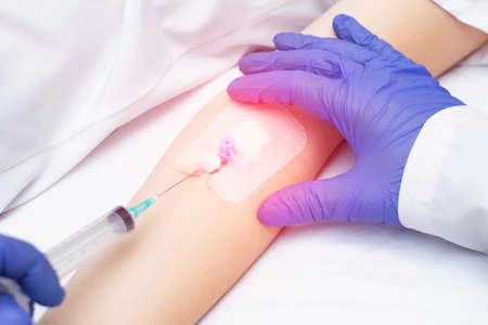 A doctor puts a venous catheter to a patient to inject drugs into a vein, close-up. bloodstream disease