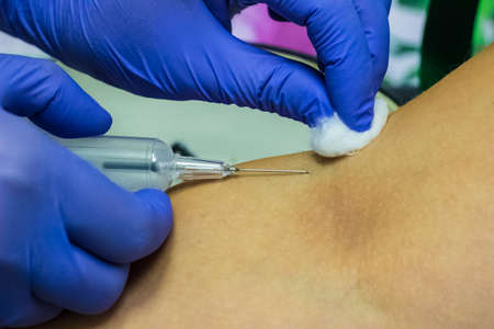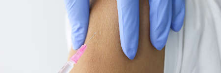 Close up of doctor hand in blue protective glove making injection with syringe to a patient.