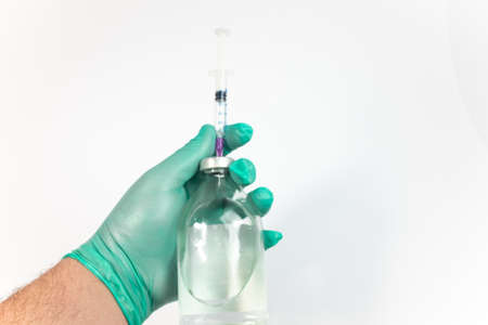 Doctor plastic gloves hand holding using syringe isolate over white background.