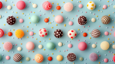 A vibrant assortment of candies featuring different colors, shapes, and textures arranged neatly against a light blue background. The collection includes spherical, round, and textured sweets scattered artistically.