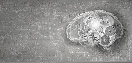 Silhouette of human head, chalk on the wall, gears in head, brainstorming, extraordinary thinking and intelligence
