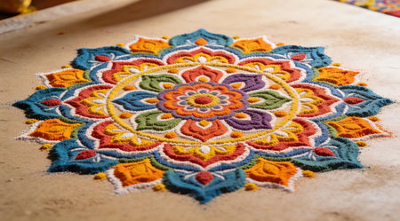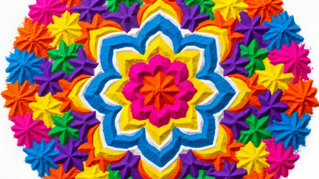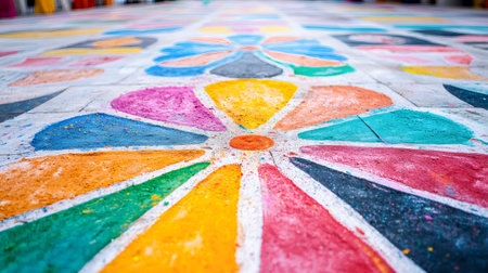 Close-Up of Intricate Floor Design with Colorful Patterns at Holi Festival. Concept of Indian Culture, Traditional Art. Background. Copy space.