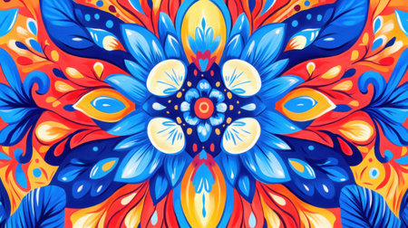 This stunning floral pattern features a beautiful blend of blue, orange, and yellow hues designed in a symmetrical, kaleidoscopic style. Perfect for various creative projects.