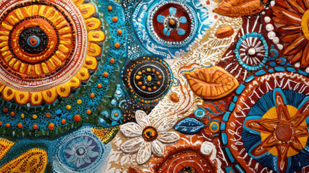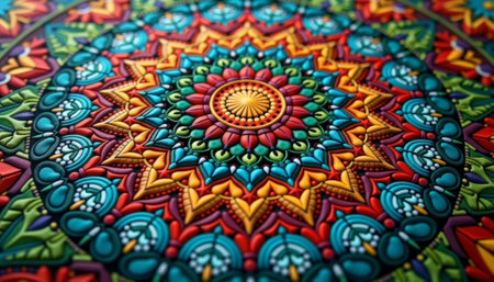 Close-up of a vibrant mandala pattern featuring intricate designs and bright colors. This artistic piece showcases texture and creativity, perfect for various uses.