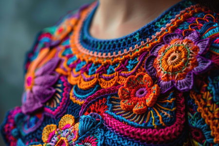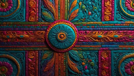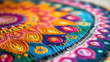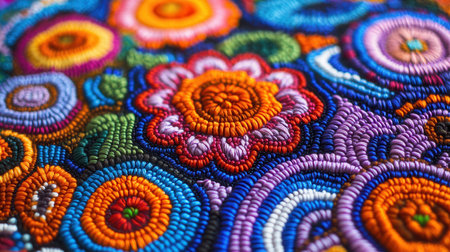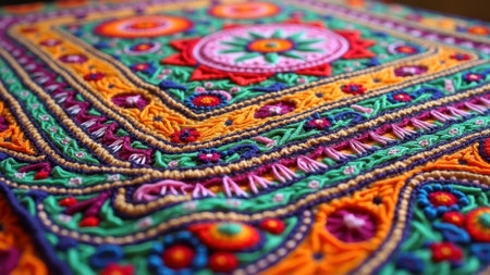 Vibrant handcrafted textile with intricate colorful embroidery patterns. That the image is generated using AI.