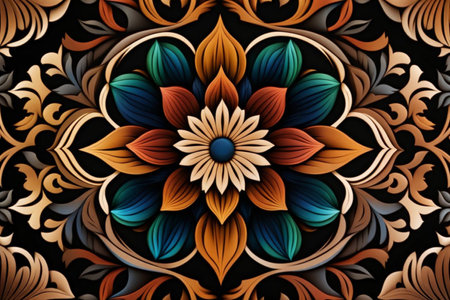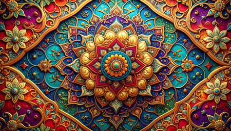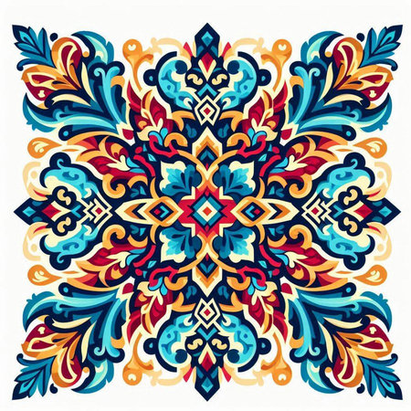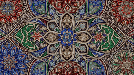 A complex symmetrical pattern with intricate geometric and floral motifs in vibrant blues reds greens and gold creating a rich decorative background.
