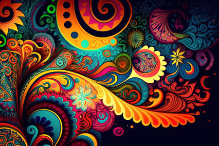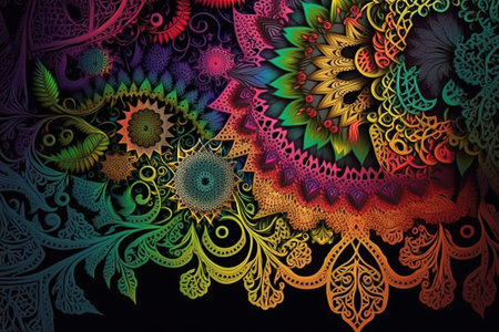 An AI generated illustration of colorful floral pattern with a vibrant psychedelic touch, featuring a captivating central light source