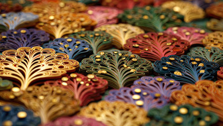 An overhead shot showcases a diverse array of ornamental patterns. They display intricate cutout designs in various colors including gold, blue, and red. The lighting is bright and even, highlighting the detailed textures. This image could be used for various creative projects, design applications, or illustrative purposes.